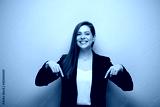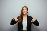 Smiling business woman in black suit pointing fingers down isolated portrait.