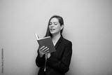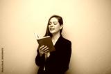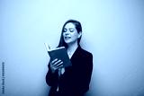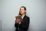 Smiling woman teacher reading book. Isolated portrait with copy space.