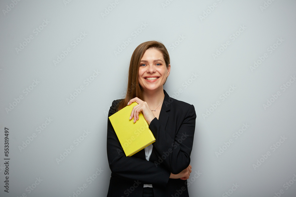 Student woman holding book. Girl in black suit. Isolated portrait with copy space.