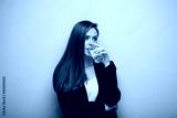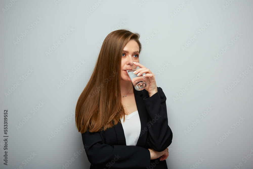 Woman drinking water from glass looking at side. isolated female portrait with black suit.