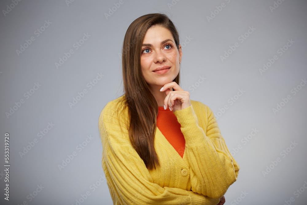 Thinking young woman touching her chin looking up. Isolated advertising portrait.