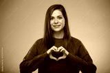 Smiling woman in green doing heart shape gest with fingers. Isolated advertising portrait.