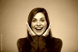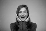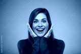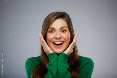 Excited young emotional woman close up face. Isolated advertising portrait of surprising girl.
