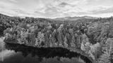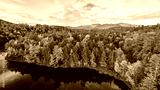 Aerial over blue lake with fall forest hills around and mountains in distance