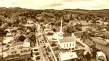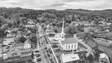 Beautiful aerial view over small Vermont town of Stowe in peak fall foliage with focus on church