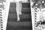 Selfie woman body legs in stockings. People walking up stairs home with Merry Christmas tree. feet socks on wood floor background.