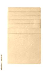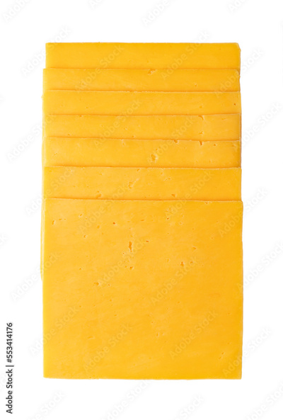 Stack of cheddar cheese slices, sliced natural cheese, sharp-tasting and colored orange with annatto, a natural food coloring. Close-up, from above, isolated on white background, macro food photo.
