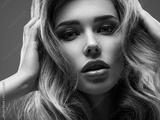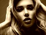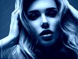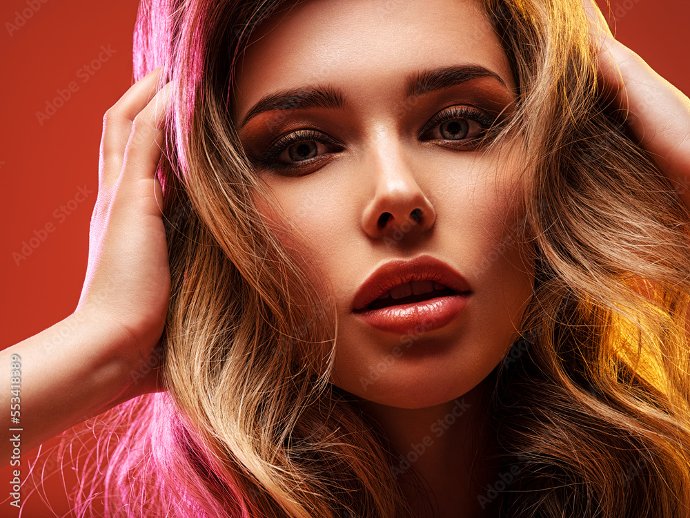 Portrait of beautiful young woman with bright shiny makeup. Blonde with brightly colored long hair. Pretty girl with long curly hair. Fashion model posing at studio. Sexy girl squeezing her head.
