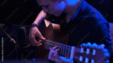 Man plays guitar. Young man plays a musical instrument. Musician records his composition in a music Studio using professional microphone