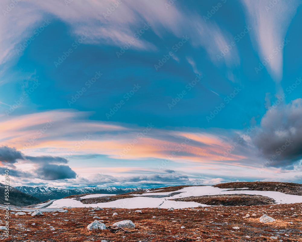 Aurlandsfjellet, Norway. Sunset Sky Above Road Aurlandsfjellet. Scenic Route Road In Summer Norwegian Landscape. Natural Norwegian Landmark And Popular Destination.