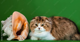 A cute Scottish fold cat sitting at flowers on green background.