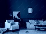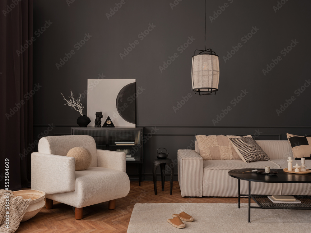 Asthetic composition of living room interior with mock up poster frame, modular sofa, black coffee table, white armchair, carpet, pouf, dark wall and personal accessories. Home decor. Template.