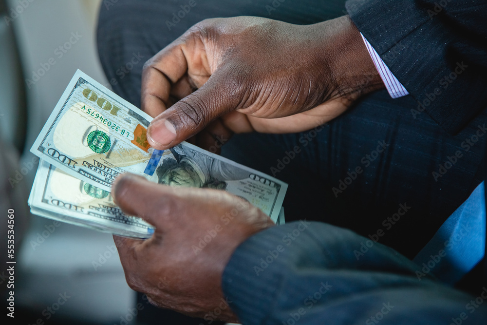 Counting paper money. Close-up of a man's hands counting dollar bills. The concept of earnings and business profitability. Benefit, profit and salary for a major purchase or acquisition,