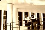 Portrait of two dark-skinned businessmen talking in the background of a modern building exterior. Friendly meeting outdoors