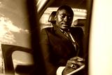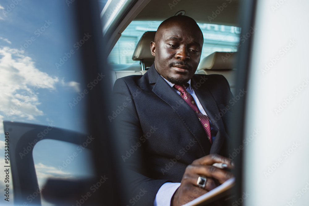 Portrait of a handsome dark-skinned businessman in a suit and glasses in the back seat of a luxury car talking on the phone