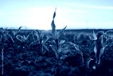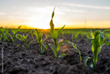 Close up young green corn leafs on agricultural field in the sunset. Corn plants growing in rows. Agriculture.