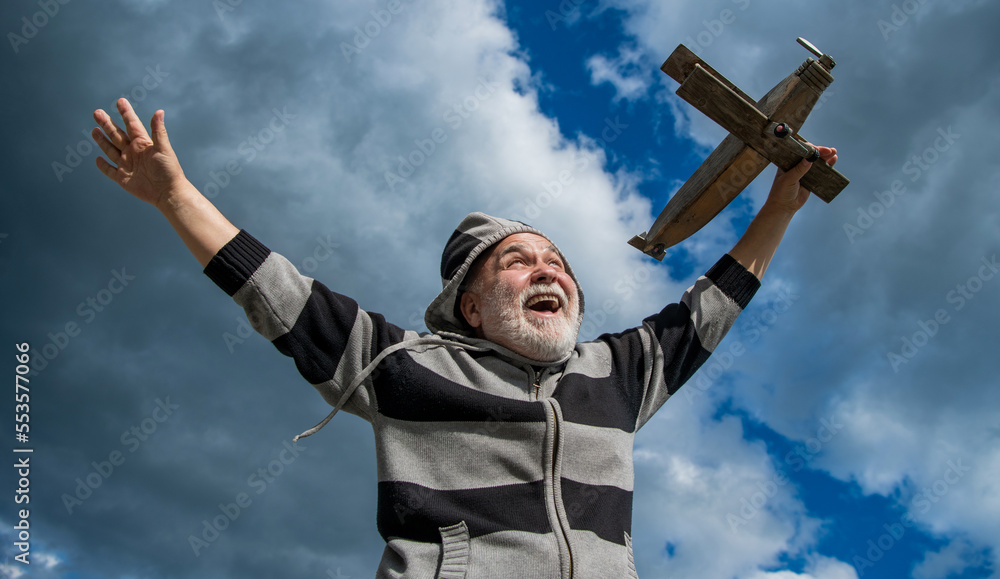 dreaming senior retired man. mature man at retirement. old man on sky background with toy plane