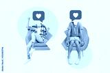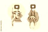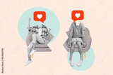Collage photo of young couple lady with her boyfriend headless like notification love story sitting chair isolated on white color background
