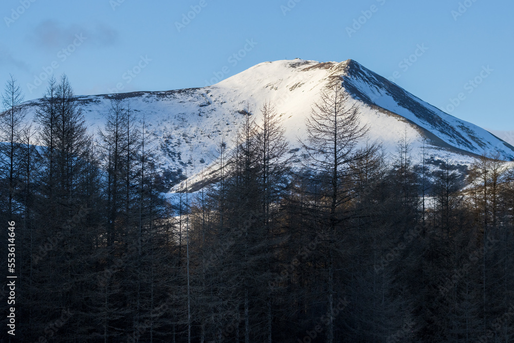 View of the larch forest and snow-capped mountains. Beautiful nature of Siberia and the Russian Far East. Travel and tourism in the Magadan region. Russia. Natural background.
