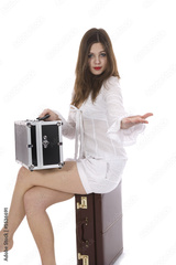 Young woman with suitcase and globe on isolated background