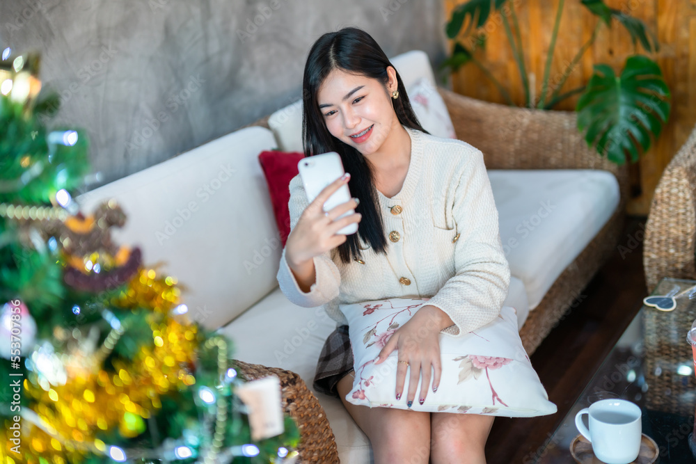 Portrait Cute beautiful positive smile young asian woman using smartphone video call or Selfie at home in the living room indoors Decoration During Christmas x-mas and New Year holidays.