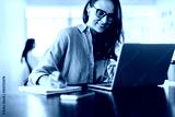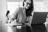 Woman making notes during an online business meeting in an office