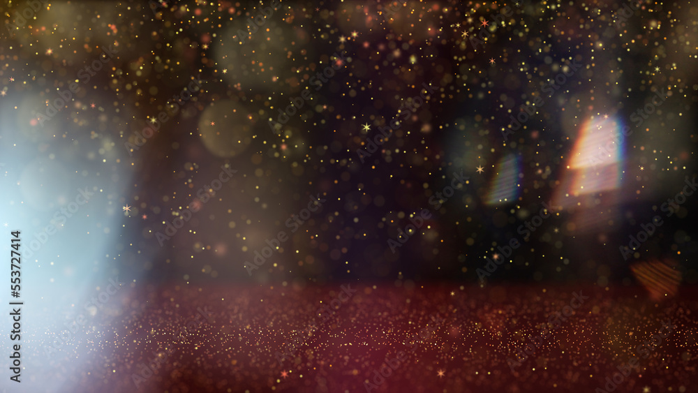 Defocused Golden Particles Glittery Dark Background with Copy Space. Shining glow bokeh background