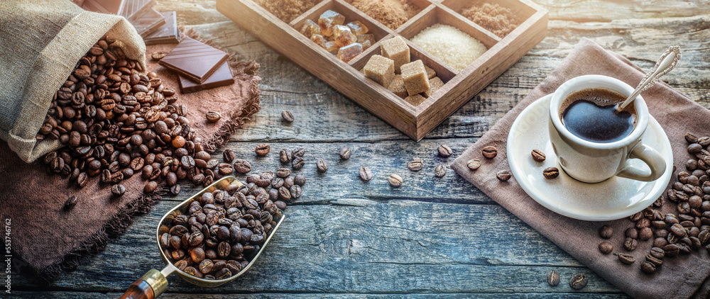Coffee cup with coffee, coffee beans, cinnamon, star anise on an old wood desk in a coffee shop. Wide image in retro style.