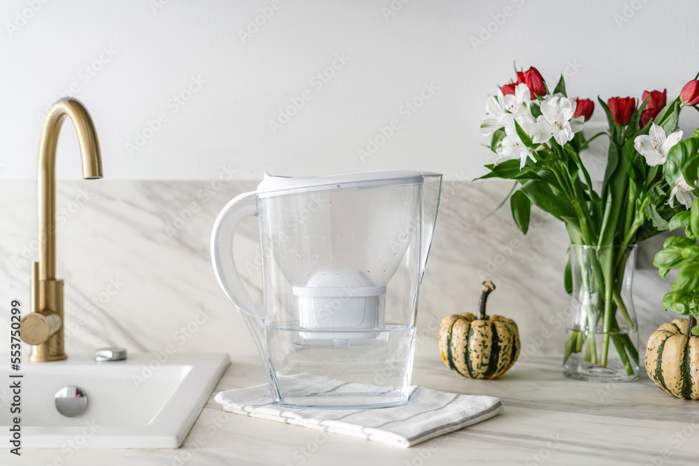 water filter jug with napkin on kitchen table