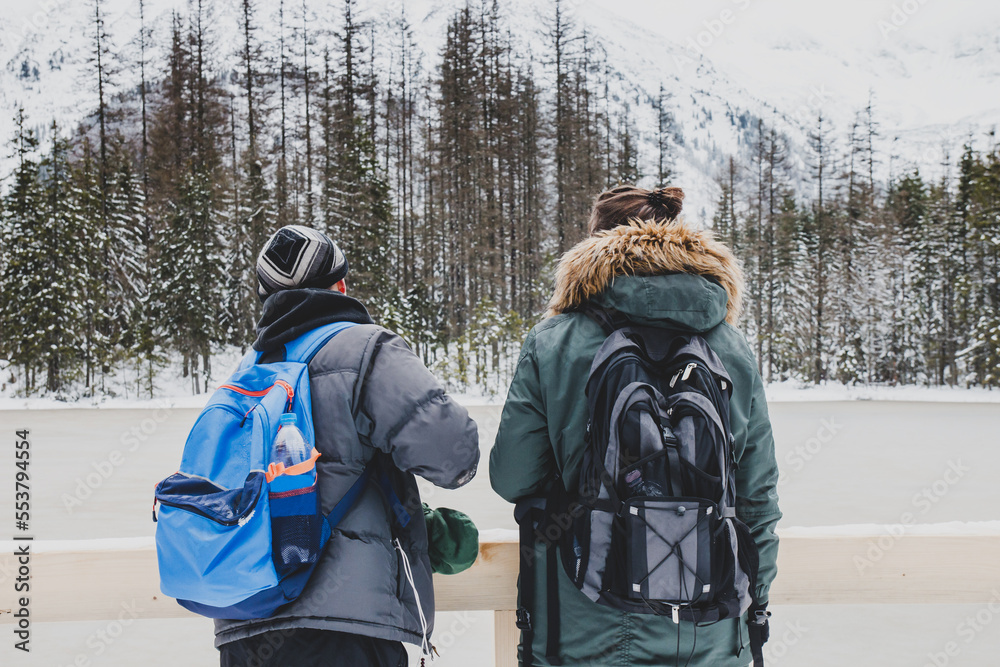 A guy and a girl look at the mountains and the frozen lake