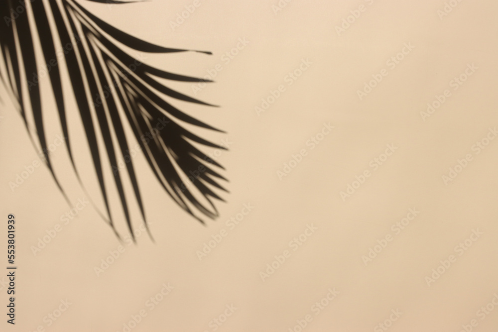 A shadow of palm leaves on a pastel beige surface background