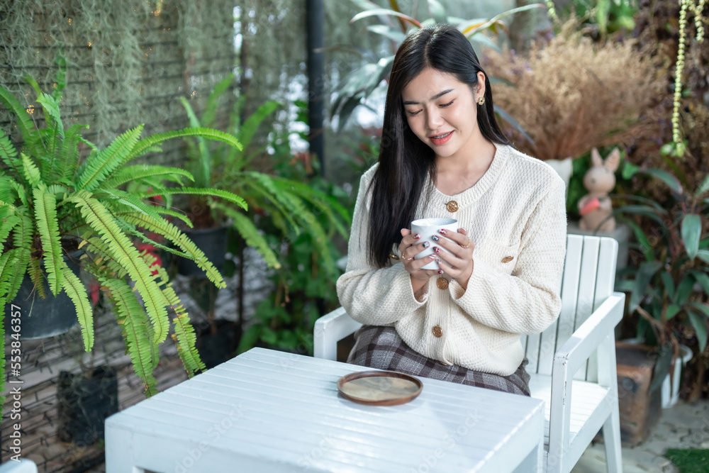 Portrait beautiful young asian woman girl wearing warm clothes enjoys drinking holding of positive the having cup of coffee,milk or chocolate at house home in the living room inside or cafe