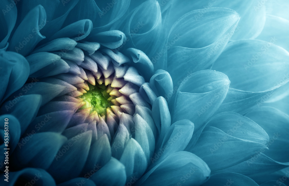 Blue flower chrysanthemum macro shot. Chrysanthemum blue, yellow color flower background.