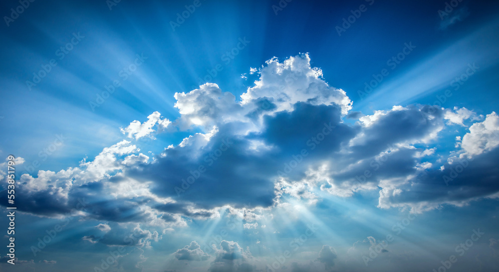 Bright sun shining in clouds on sky. Good background on the theme of religion, freedom, etc. Beautiful view of the sky.
