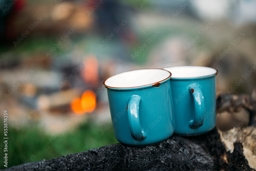 cup of coffee. Camping coffee cups. Camping. Forest. Background. Nature.