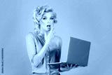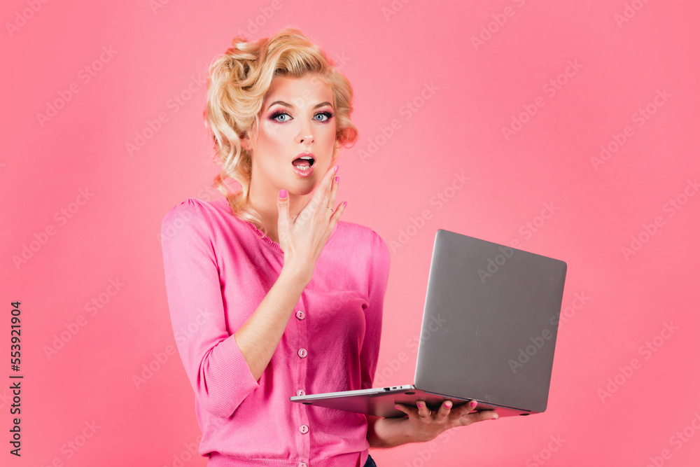 Beautiful sexy blonde pinup pop art woman on pink isolated background working with laptop.