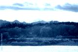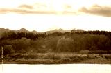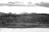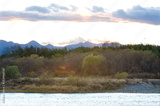 利根川と赤久縄山が見える景色に沈む冬の夕日