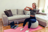 Young adult sportswoman doing exercise using fitness ball in a class of yoga at home. Happy pretty young woman sitting on ball stretching arm at home.