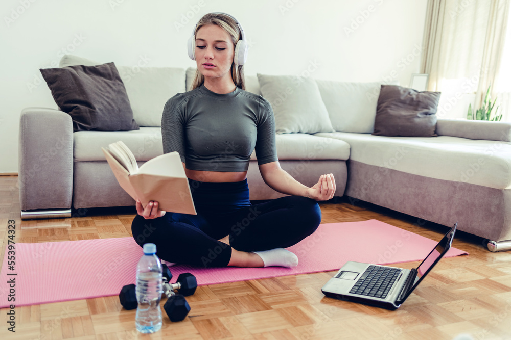 Girl reading book and listening the music while sitting in pose of lotus in the living room during the day.