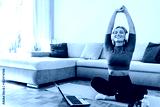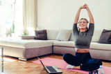 Shot of a young woman listening to music while meditating at home. Portrait of a sporty young woman stretching her arms while exercising at home.