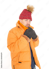 Young handsome man wearing in red hat and yellow down jacket feeling cold on white background