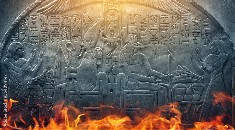 Ancient Egyptian deities Osiris and Anubis, Egyptian hieroglyphs. Historical and culture background. Ancient Egyptian hieroglyphs as a symbol of the history of the Earth.