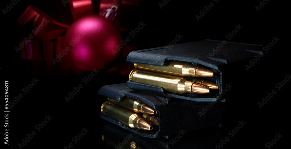 Pair of loaded magazines with a Christmas ornament