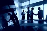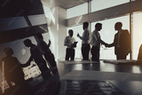 Silhouettes of people standing near a panoramic window in a modern office. Team of young professional business people working and chatting together in a meeting.