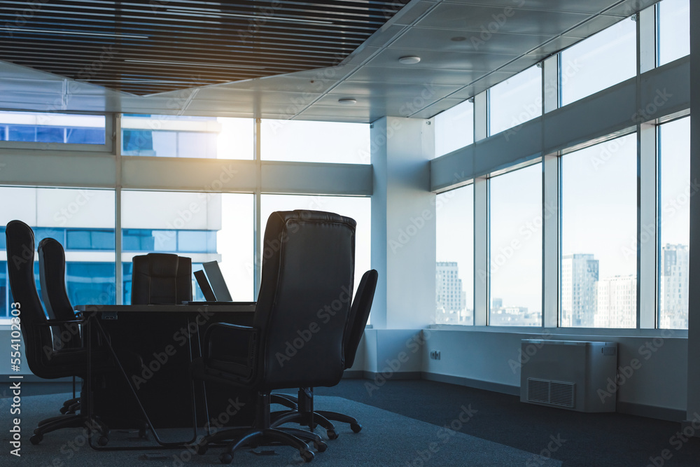The interior of an empty modern office with a table and chairs and a meeting room with panoramic windows against the backdrop of the buildings of a big city