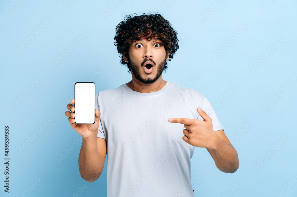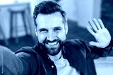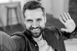 Cheerful attractive positive caucasian bearded man, in a casual shirt, takes a selfie on his smartphone, waves hand, looks into the front camera of the mobile phone, smiles friendly