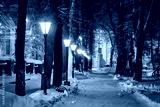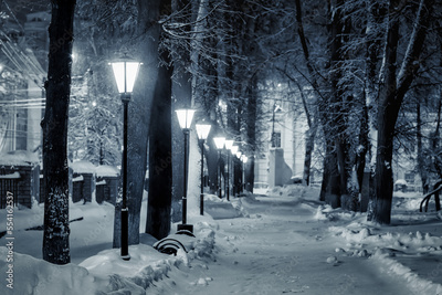 Winter park at night with lights, pavement covered with snow and trees after snowfall.