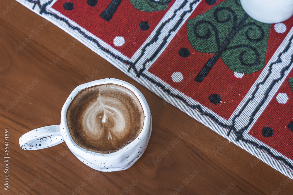 Close up of Hot coffee latte with latte art milk foam in cup mug with Xmas decors and Xmas tree baubles on wood desk Celebrating Merry Christmas and New year.