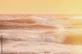 Riplpe sea ocean water surface with small waves. Close up of sea foam from breaking wave. Natural sunset sky warm colors. Beautiful nature seascape.