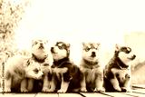 Five Four-week-old Husky Puppy Of White-gray-black-brown Color Sitting On Wooden Floor Together.